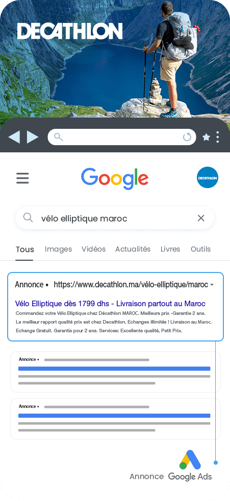 Annoncer sur Google Ads avec ENERGIEDIN, c'est travailler avec une agence SEA (Search Engine Adversiting) basée au Maroc qui prendra grand soin de respecter votre budget journalier et vos attentes en termee de retour sur investissement au quotidien. Nous gérons des budgets publicitaires de quelques centaines d'euros par mois à plusieurs dizaines de milliers d'euros par mois, en français et en anglais.